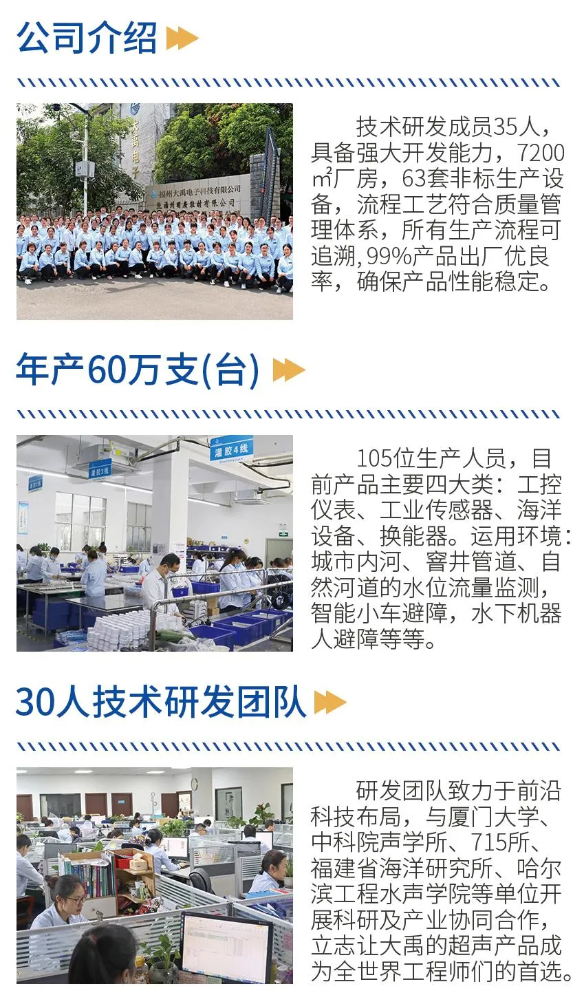 福州大禹電子科技有限公司成立于2008年自創(chuàng)辦以來(lái),專注超聲產(chǎn)品的研發(fā)和產(chǎn)業(yè)化,根據(jù)超聲波原理開發(fā)各種產(chǎn)品,目前產(chǎn)品主要四大類:工控儀表、工業(yè)傳感器、海洋設(shè)備、換能器。公司產(chǎn)品應(yīng)用場(chǎng)景:超聲波產(chǎn)品,超聲波測(cè)距,監(jiān)測(cè)水位、監(jiān)測(cè)流量、水下機(jī)器人避障、水下通訊、水池水位控制。